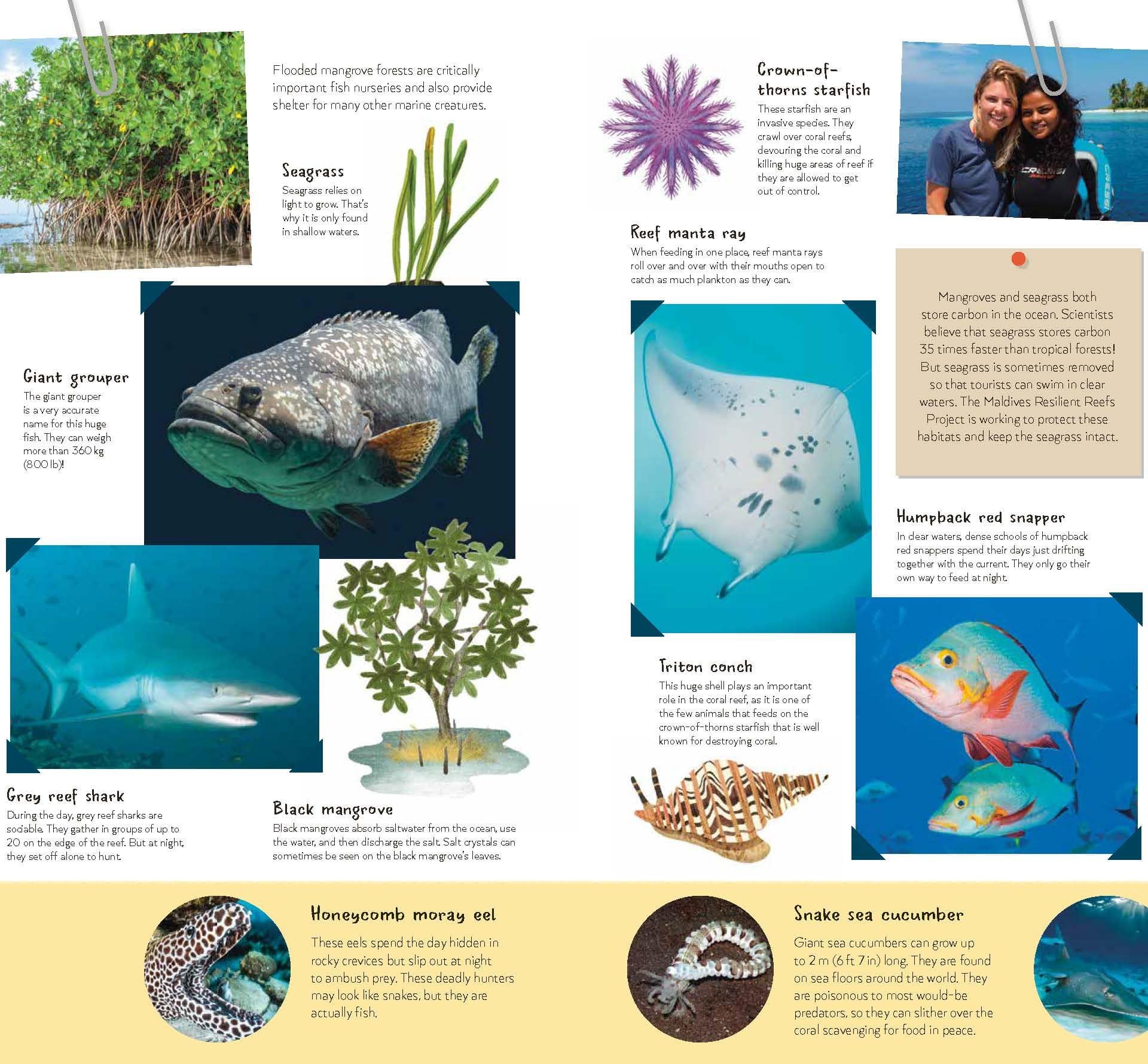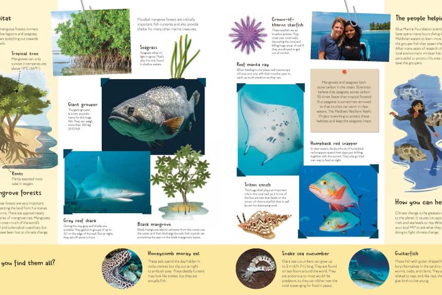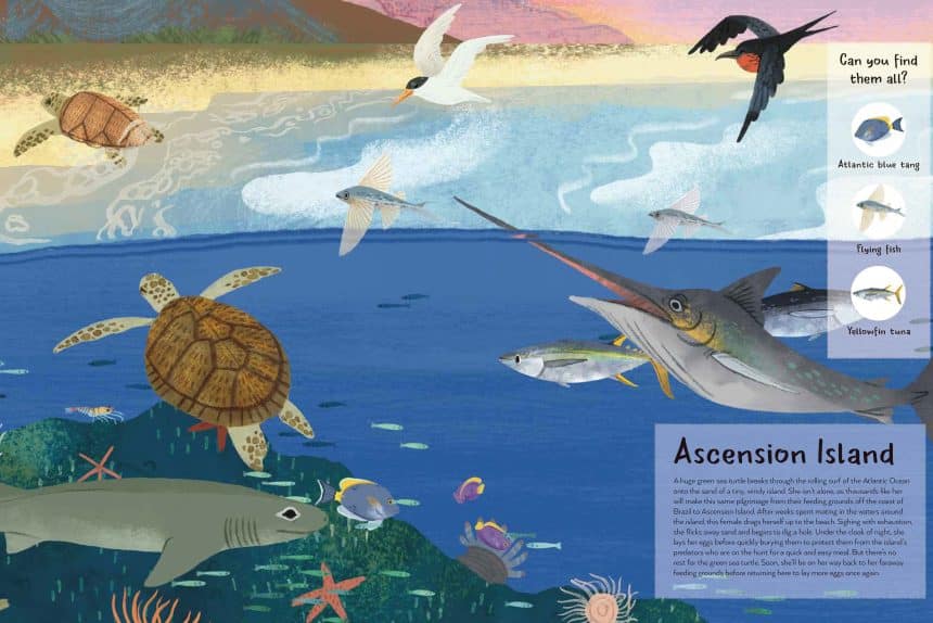 Through this book, you’ll be traveling to some of the places where Blue Marine works, to meet the wonderful creatures beneath the waves: short-snouted seahorses, migrating green turtles, elegant flamingos, grumpy groupers, mysterious whiskered fish – and many more!